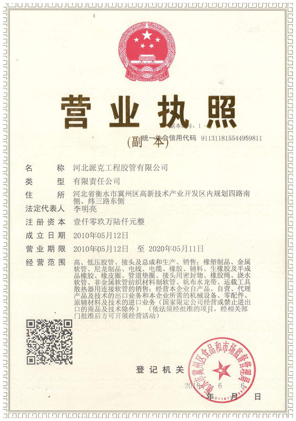 河北派克工程膠管有限公司——資質榮譽